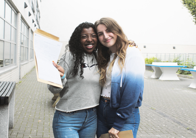 Kimberley Koxha-Doci and Safia Cabdalle celebrate their BTec results at City of London Academy Islington