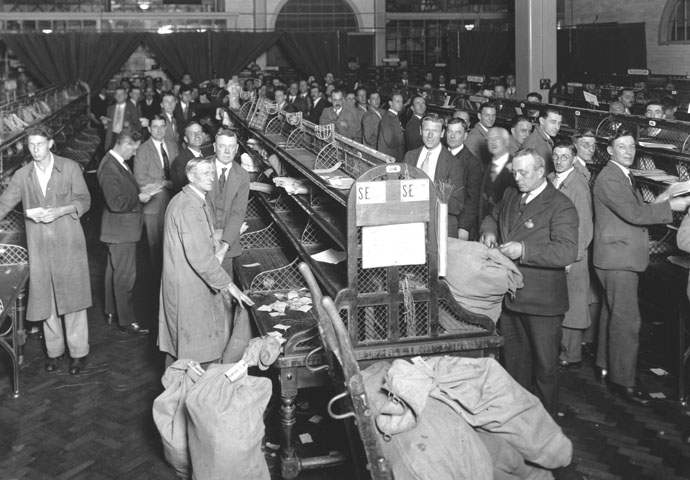 King Edward Building, Sorting Office, EC district despatching 1928 © Royal Mail Group, courtesy of The Postal Museum