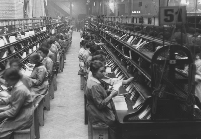 Mount Pleasant Sorting Office Letter sorting by women c.1914 © Royal Mail Group, courtesy of The Postal Museum
