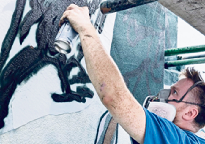 Artist Freddie Denton at work on the artwork