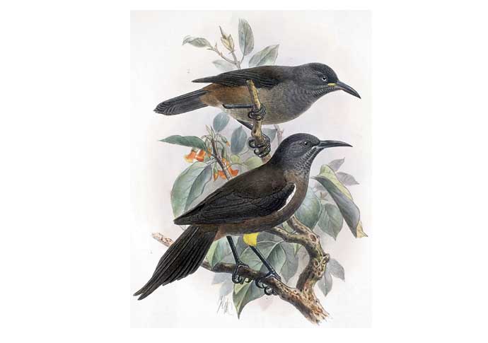 An illustration of an adult and juvenile Kauai O’o A’a (Moho braccatus), now extinct, by JG Keulemans (1842–1912) [The British Library]