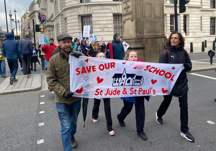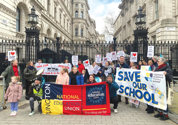 I found the National Education Union’s Pippa Dowswell in a crowd of blue union flags and banners, who told me schools are on the line because of “falling rolls”. That is, they don’t have enough children to stay financially viable.