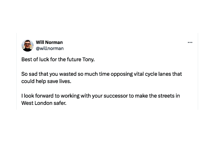 This listicle began with the message: “Best of luck for the future Tony. So sad that you wasted so much time opposing vital cycle lanes that could help save lives… I look forward to working with your successor to make the streets in West London safer.”