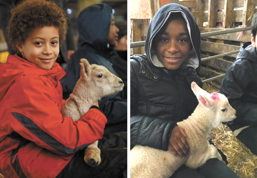 Joshua, left, and Marbel from Canonbury Primary meet the lambs at Lower Treginnis