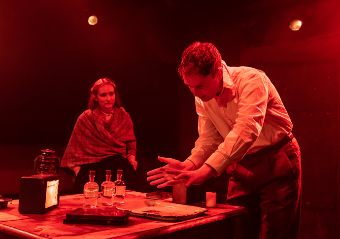 Greig’s piece is a fiction; however, he does draw specifically from the Scottish island Gruinard, which was used to experiment with chemical weaponry in anticipation of possible chemical warfare with Nazi Germany. The sole proprietor of the play’s fictional island which our two naturalists have to deal with is the allegorically named Kirk (nicely played by Ken Drury) – a royal pain in the proverbial – a low-church preacher and sheep farmer, and his niece Ellen (Rose Wardlaw), who is a curious mixture of lack of sophistication and sexuality.