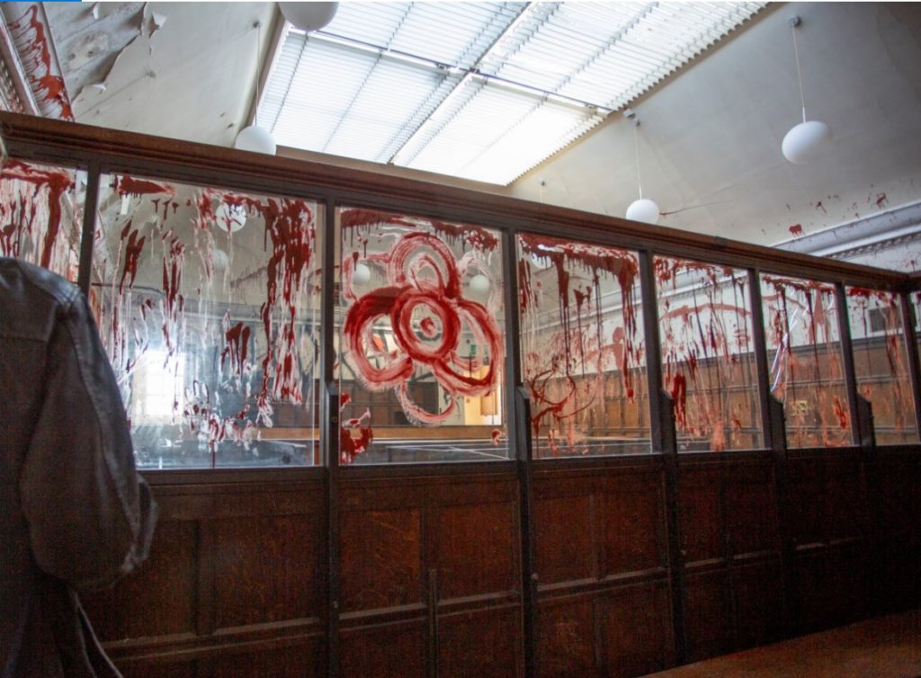 Shocked readers saw how black and red paint had been daubed on its white walls and wood panelling, with some of the graffiti spelling “bloodrave”.